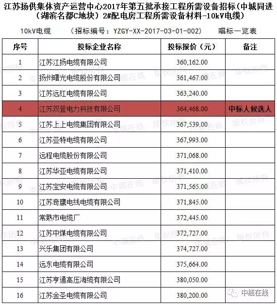 據(jù)悉,江蘇揚(yáng)供集體資產(chǎn)運(yùn)營中心2017年第五批承接工程所需設(shè)備招標(biāo),包含項(xiàng)目為:中城同進(jìn)(湖濱名都C地塊)2#配電房工程所需設(shè)備材料-10kV電纜,中城同進(jìn)(湖濱名都C地塊)2#配電房工程所需設(shè)備材料-1kV電纜。招標(biāo)人為江蘇揚(yáng)供集體資產(chǎn)運(yùn)營中心,項(xiàng)目單位為揚(yáng)州廣源集團(tuán)有限公司,招標(biāo)代理機(jī)構(gòu)為江蘇新興電力建設(shè)實(shí)業(yè)有限公司。該項(xiàng)目于2017年3月27日10時(shí)在揚(yáng)州廣源丁山大酒店進(jìn)行了公開開標(biāo)。